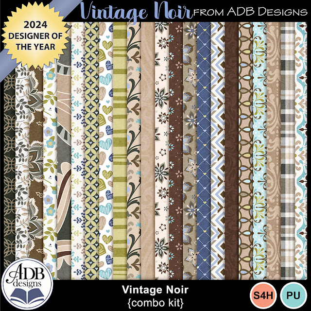 Film Noir is a style of movies from the post-WWII era, and is characterized by existentialism, cynical heroes, and intricate plots. My latest heritage digital scrapbook collection, Vintage Noir, is meant to evoke that film style and is ideal for old black and white photos of that time frame, but really works for any photo in any era.